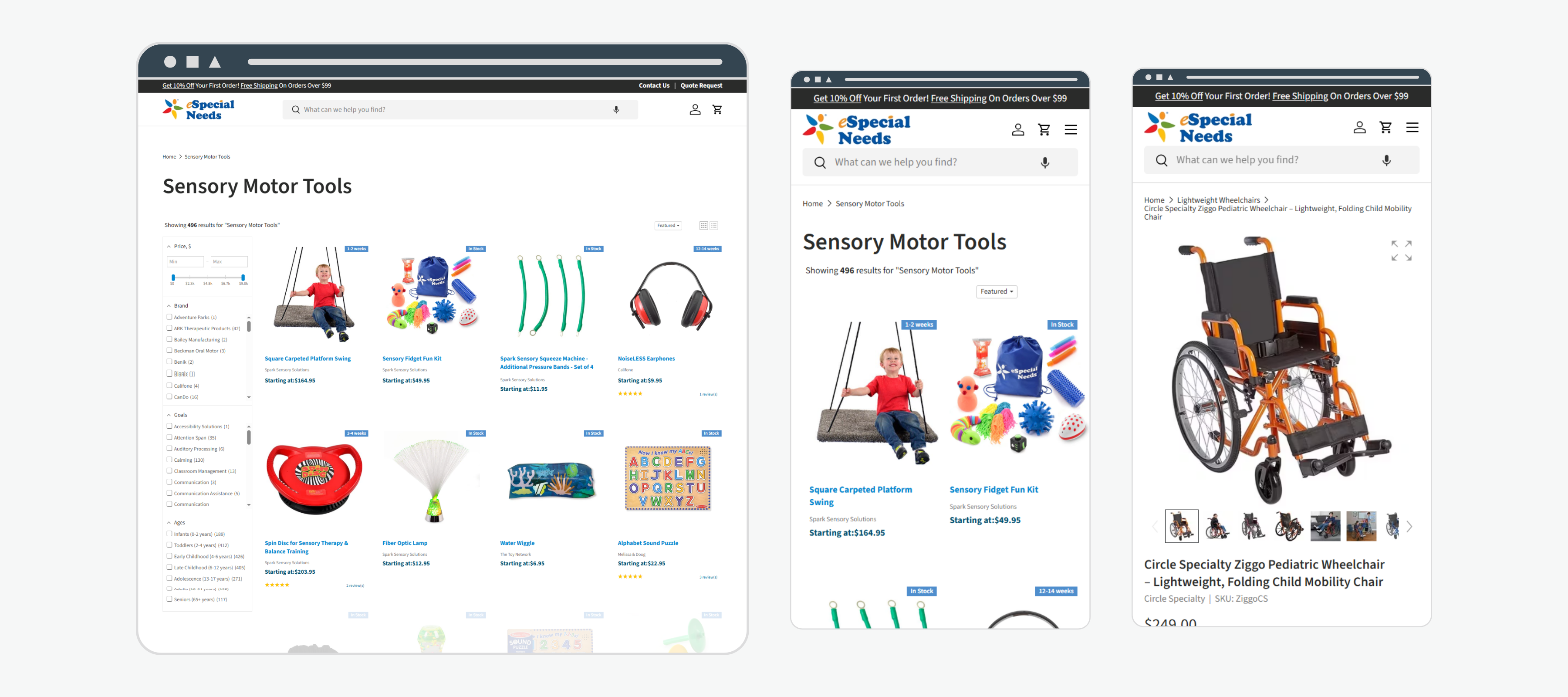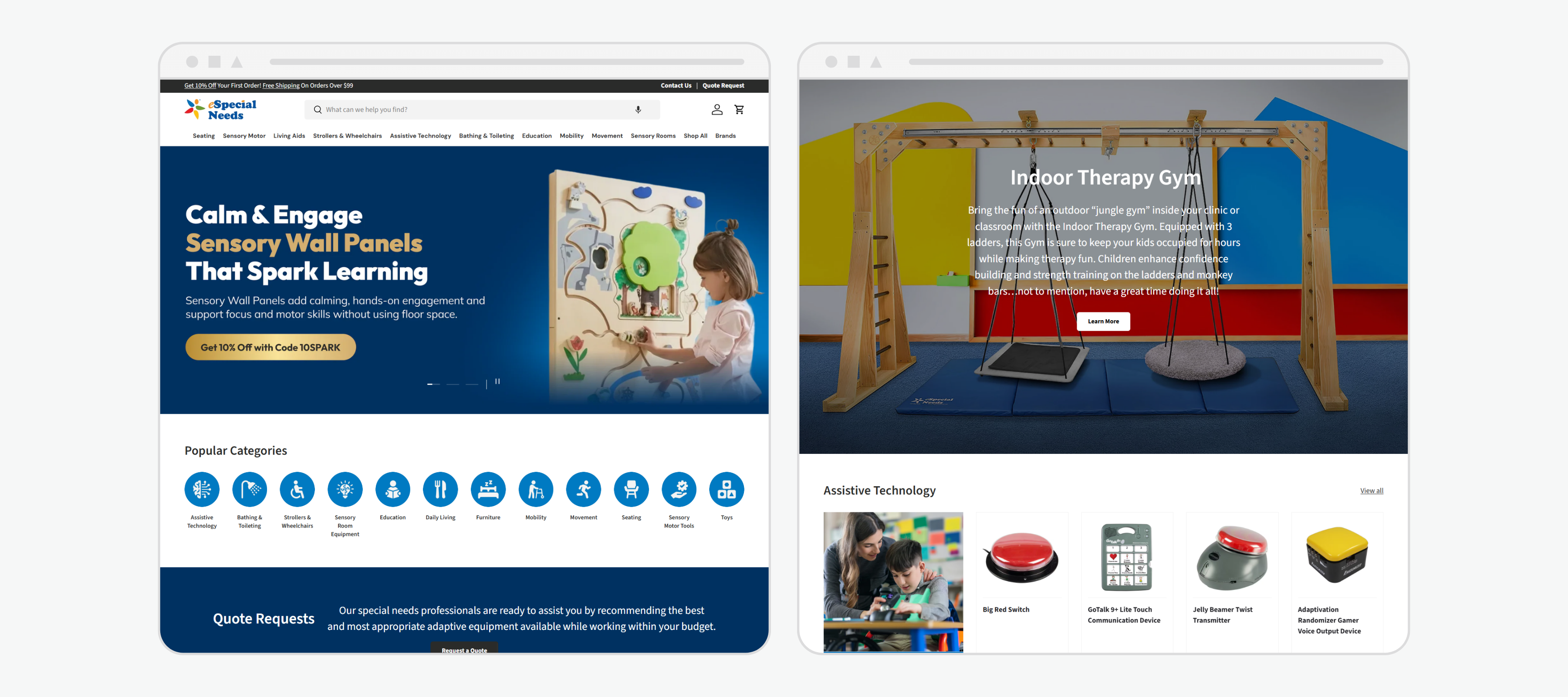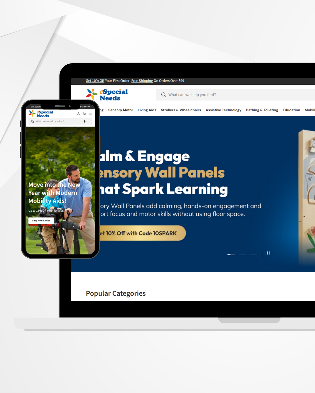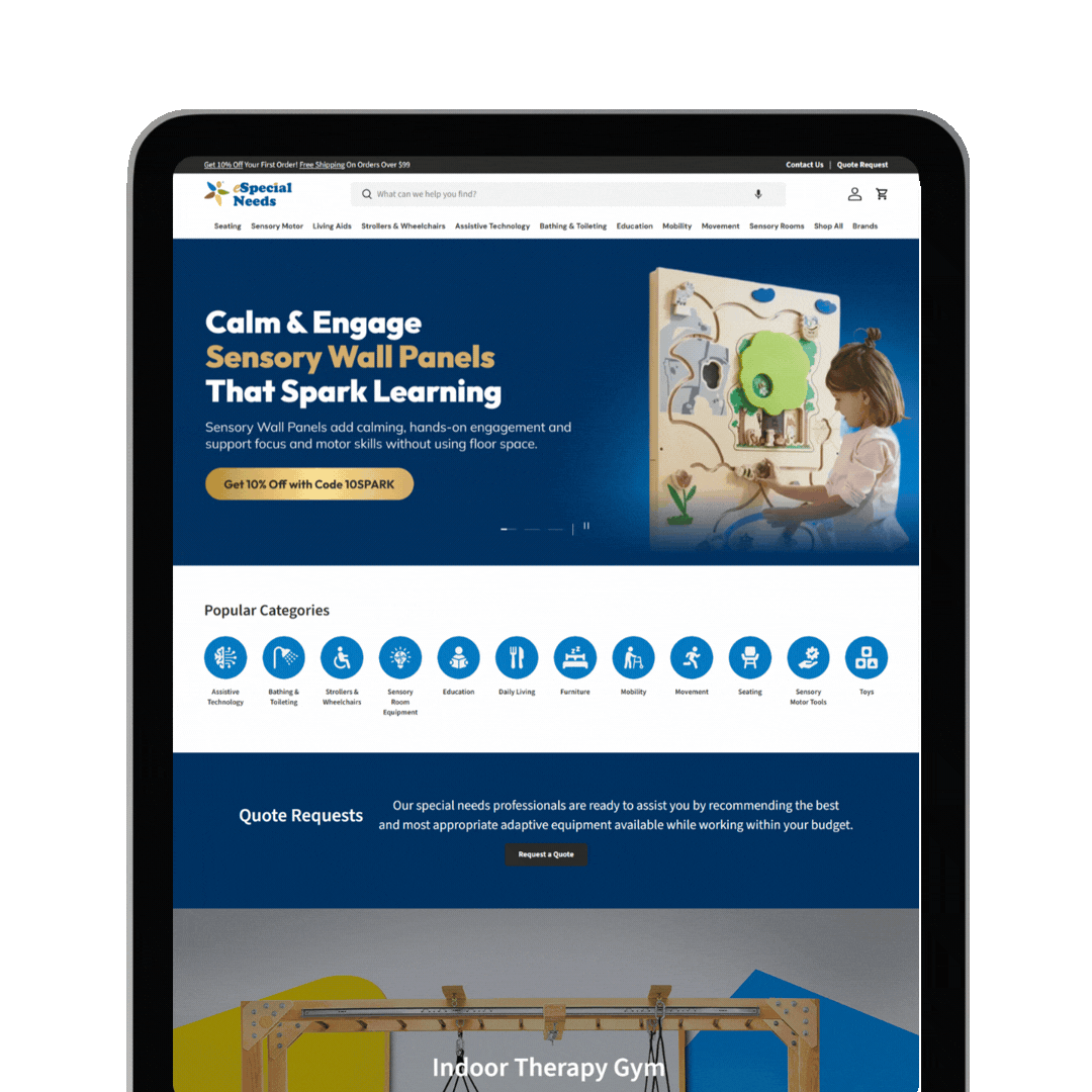 eSpecial Needs is a specialized ecommerce destination offering adaptive equipment, sensory tools, mobility products, and daily living aids designed to support individuals with special needs and healthcare professionals. With a broad inventory and diverse audience segments, the site required a modernized ecommerce experience focused on clarity, accessibility, and conversion — all while maintaining strong performance.