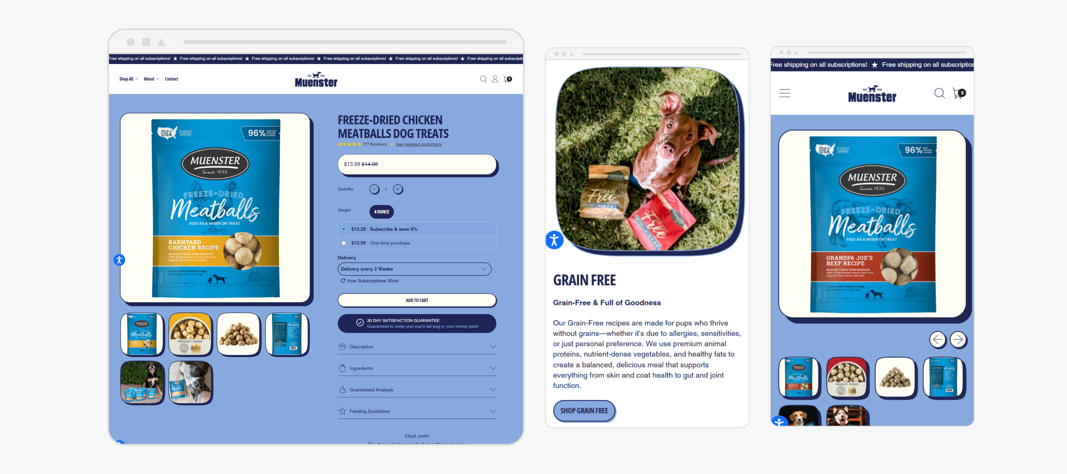 Subscription Option: Muenster Product Page offers an easy-to-use subscription feature that lets customers schedule recurring deliveries of their pet’s favorite freeze-dried beef meatballs, enjoying convenience and savings with every order.